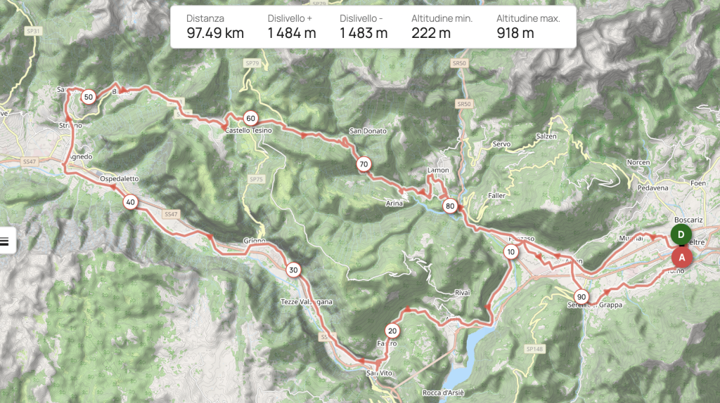 Si andrà in direzione Arsiè, si scenderanno le Scale di Primolano e poi direzione Strigno, salita del Murello e Castello Tesino con rientro per la Roa, Lamon, Fonzaso, Feltre.